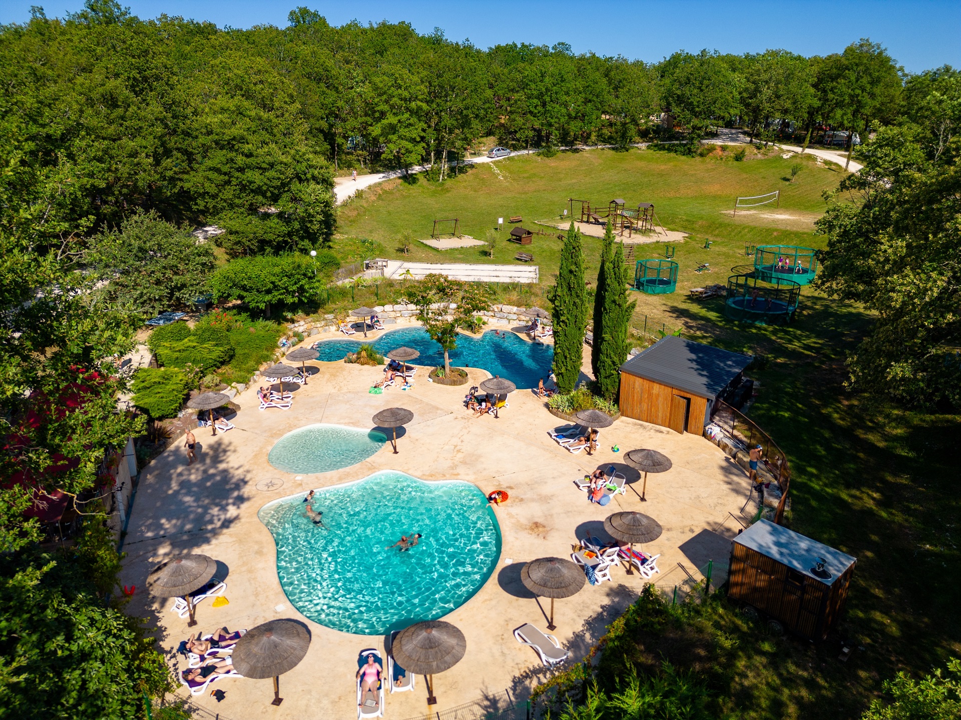Grâce à la disposition des emplacements de camping, en terrasse autour d’une immense plaine de jeux, vous pouvez à distance veiller sur vos enfants qui profitent en toute sécurité de la piscine chauffée, des trampolines et des jeux.